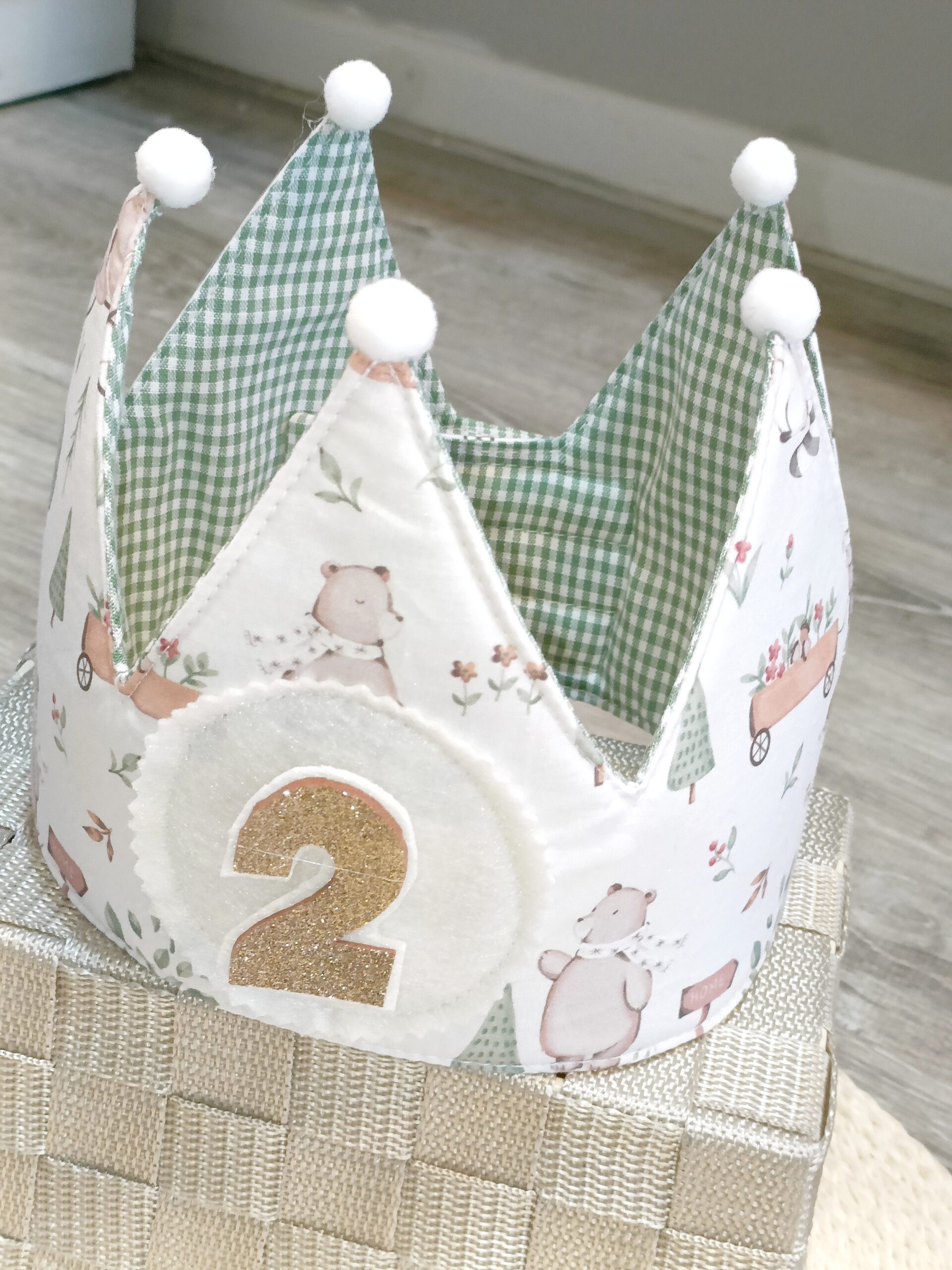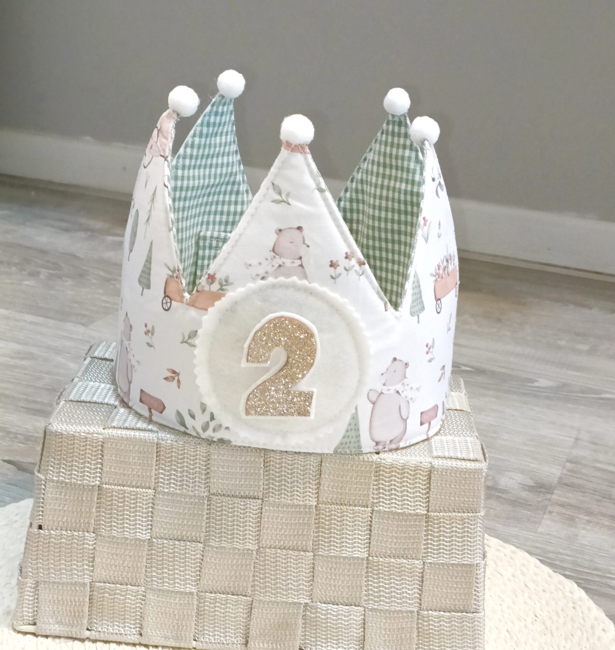 Corona con tela osos en el exterior y vichy verde en el interior , ajuste con velcro