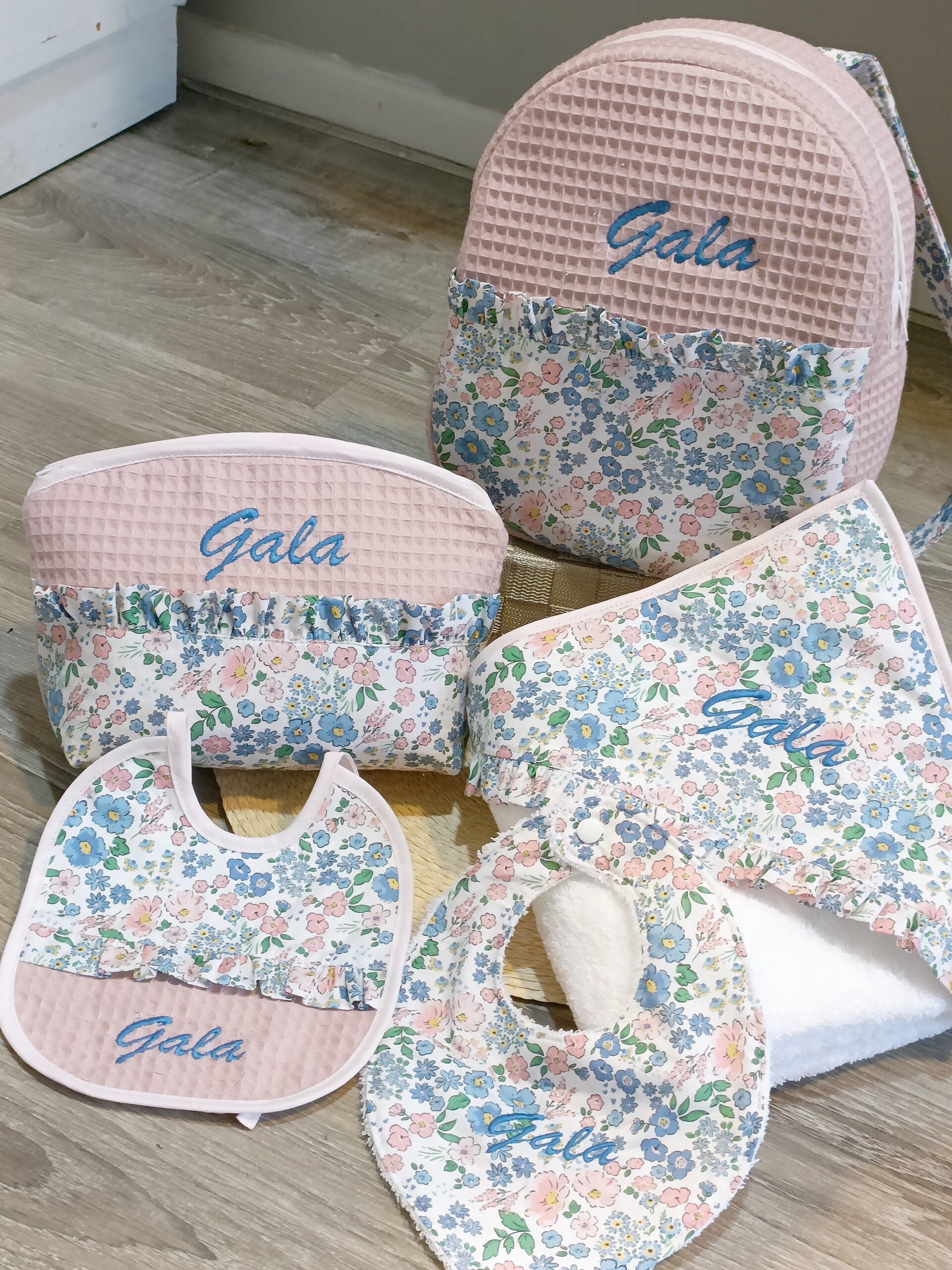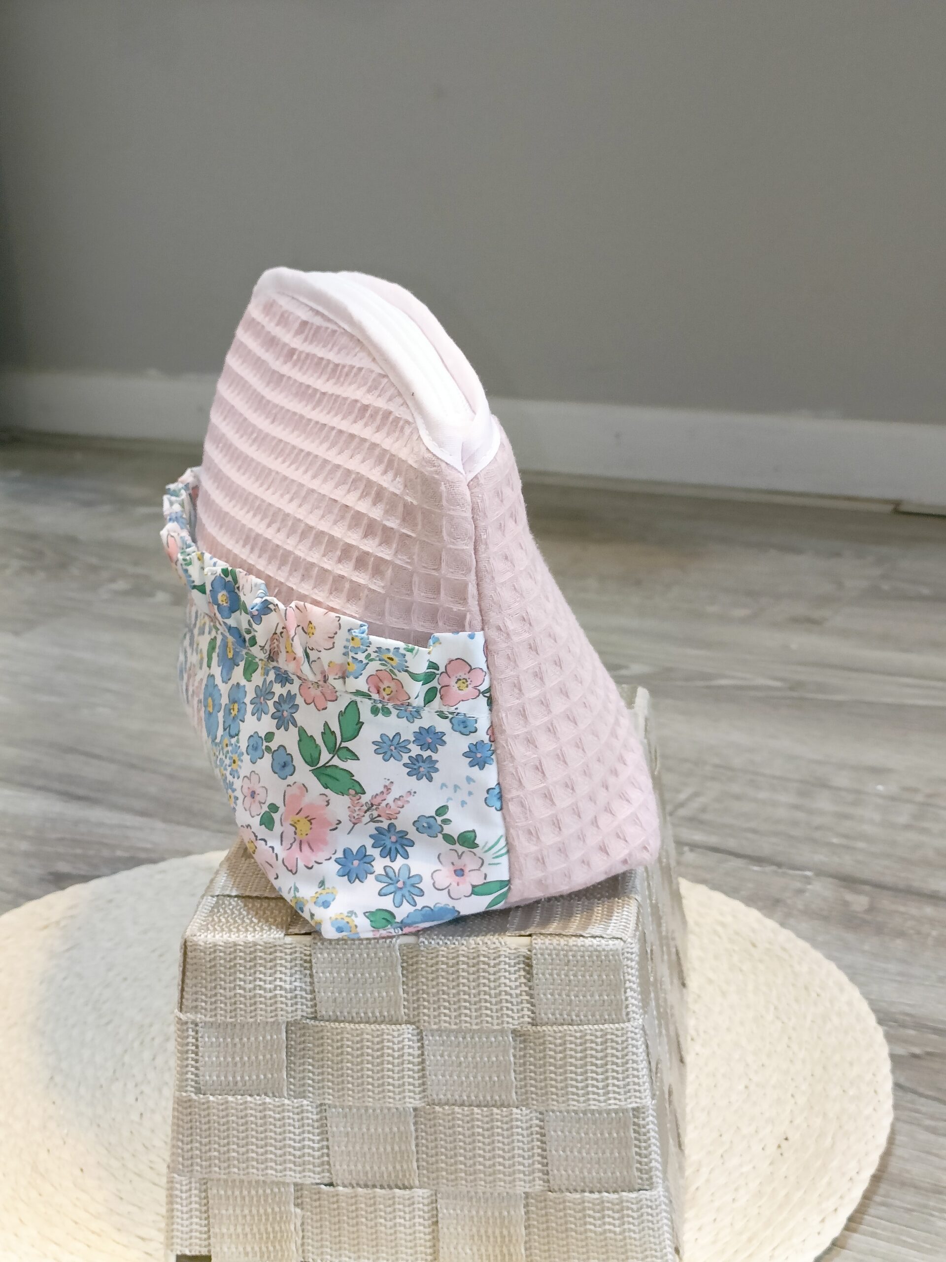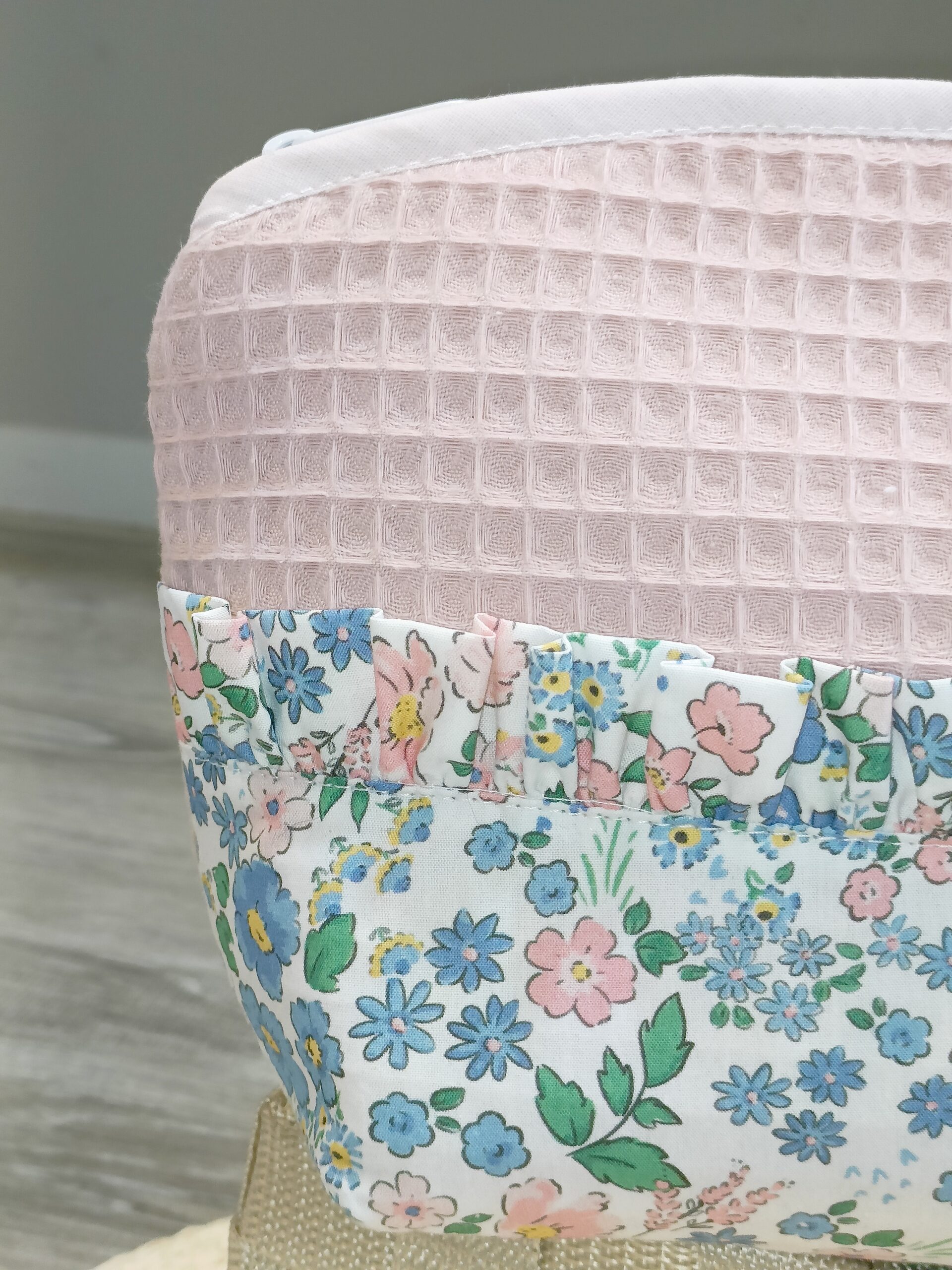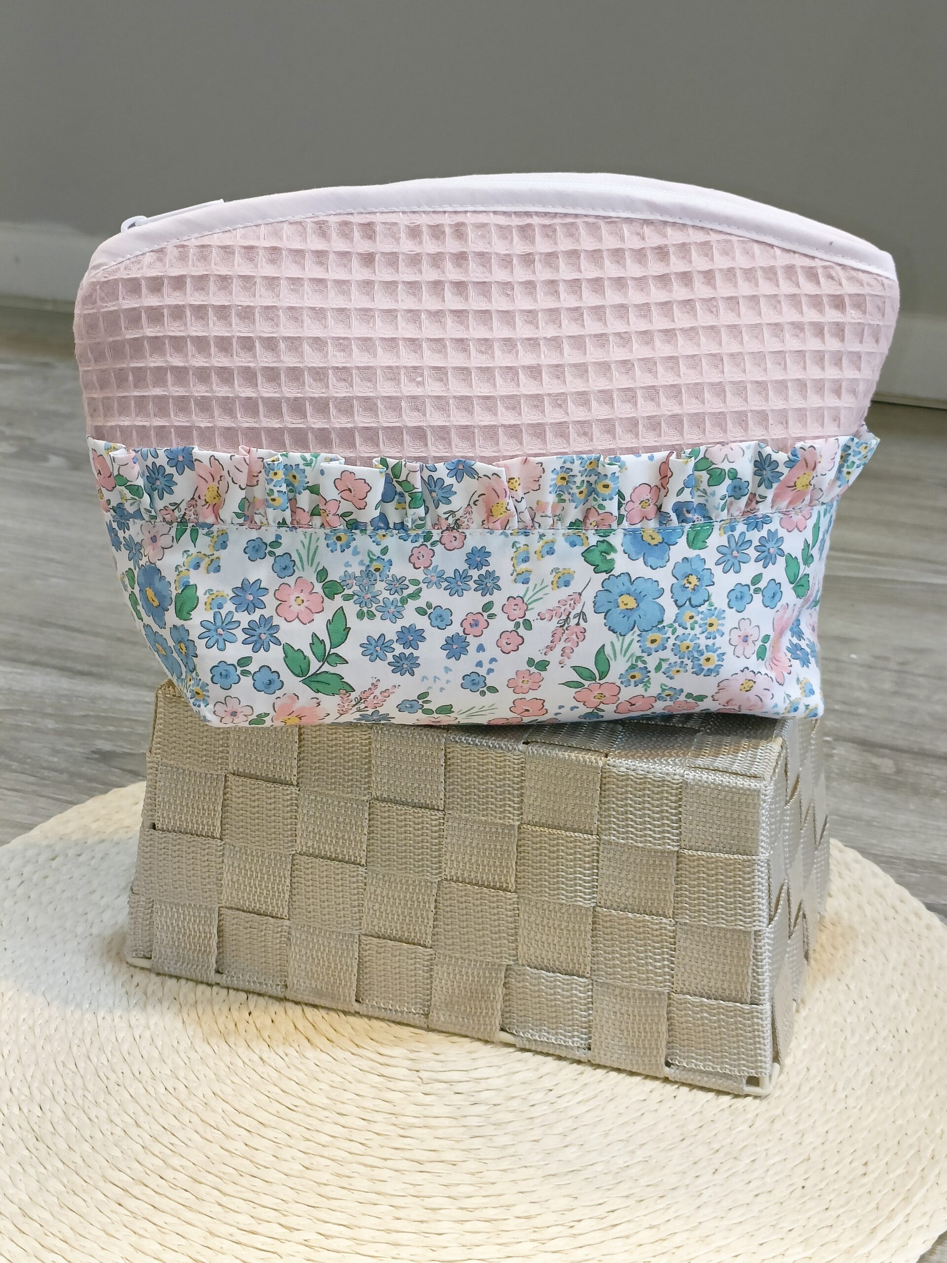 Neceser en tela waffle rosa empolvado con tela flores y volante en flores ; cierre con cremallera blanca .