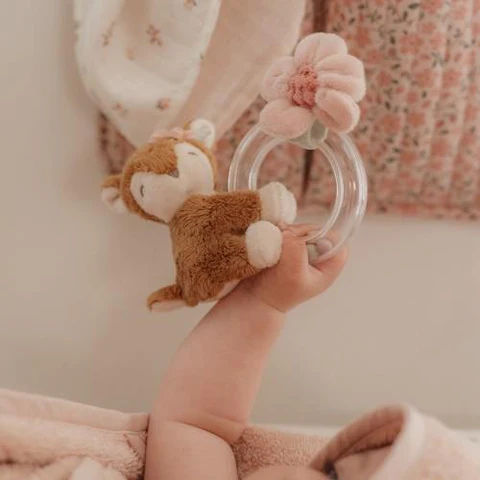 ¡Agárralo, gíralo y agítalo! La dulce cierva de suave pelaje te invita a jugar y hacer sonar este sonajero. La pequeña flor lo ha escogido especialmente para que lo abraces. El anillo transparente contiene 3 pequeñas bolitas que suenan al chocar con él. Este atractivo juguete para bebés no solo estimula sus sentidos y su curiosidad, sino que también favorece la coordinación ojo-mano.