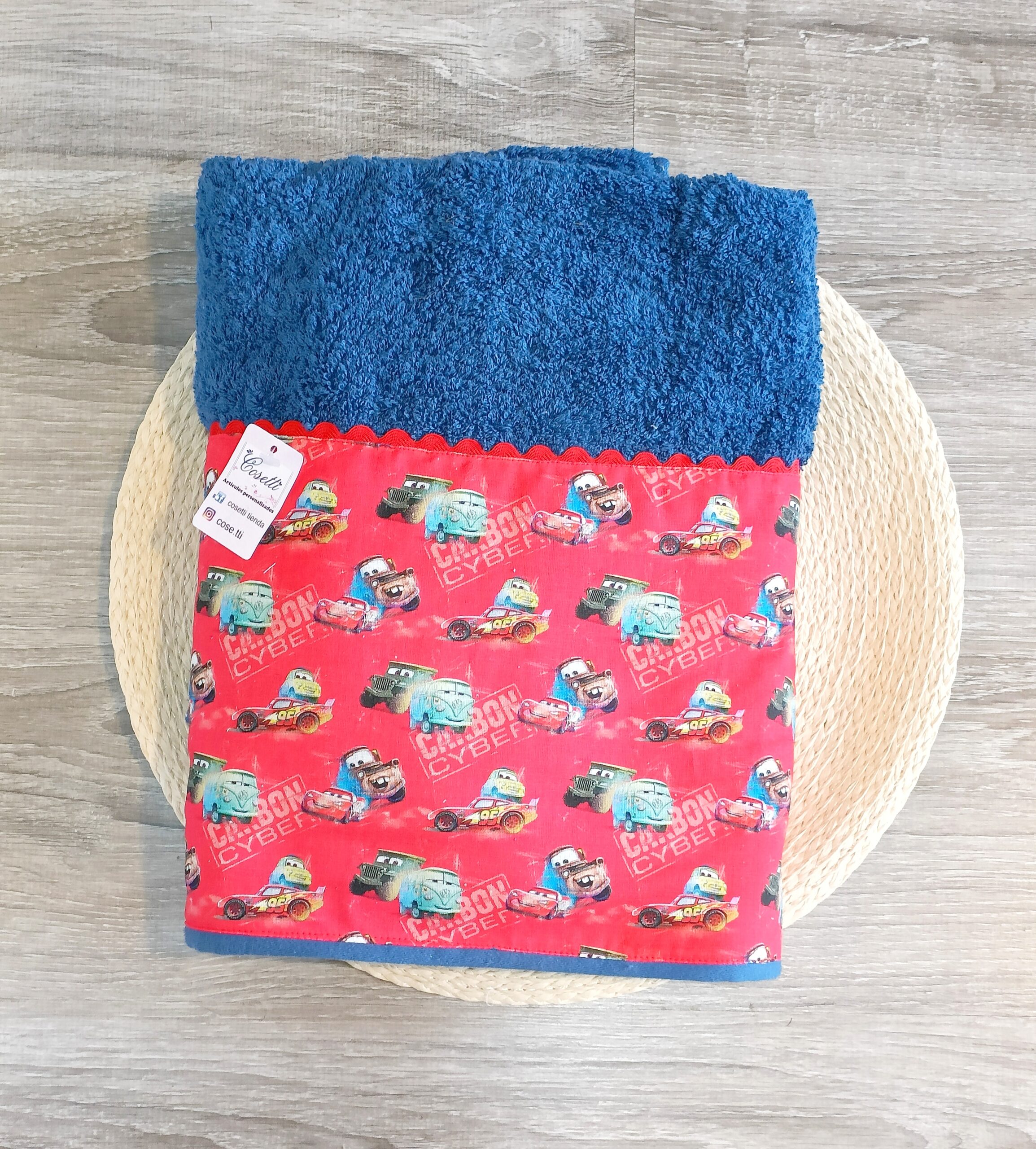 Toalla de algodón 100% en color marino con medida 70*140 cm con adorno de tela de cars y ondulina en rojo